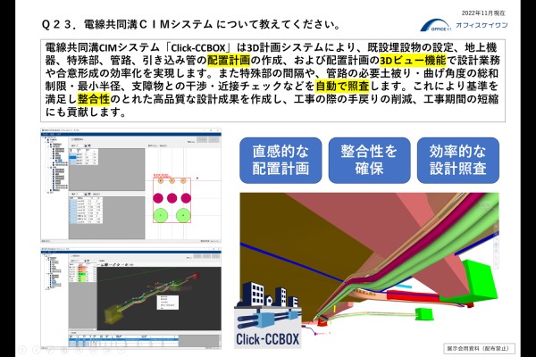 2022年12月7日(水)~9日(金)に開催された「メンテナンス・レジリエンス OSAKA 2022」(会場:インテックス大阪) にて、電線共同溝CIMシステムおよび橋梁CIMシステムを展示いたしました。ご多忙の中、足を運んでくださいました皆様、誠にありがとうございました。