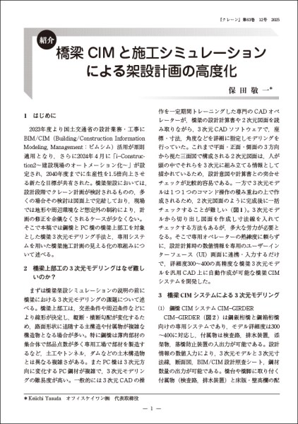 2025年年12号の月刊誌「クレーン」に、当社の取り組みが紹介されましたのでお知らせいたします。橋梁CIMと施工シミュレーションにより、設計と施工のデータ連携を実現し、架設計画の精度と安全性を向上させる取り組みを紹介。クレーン動作の可視化やVRによる施工検証により、生産性向上とリスク低減に貢献する内容です。ぜひご一読よろしくお願いいたします。