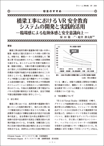 2026年3月号の月刊誌「クレーン」の「安全のすすめ」編に、当社のVR教育の取り組みが紹介されましたのでお知らせいたします。橋梁メーカーと共同開発した「橋梁工事VR安全教育システム」の概要と活用事例を紹介しています。ぜひご一読よろしくお願いいたします。