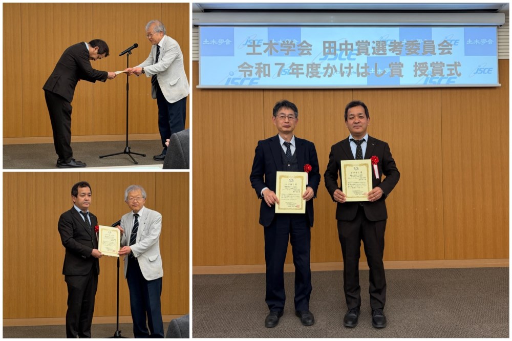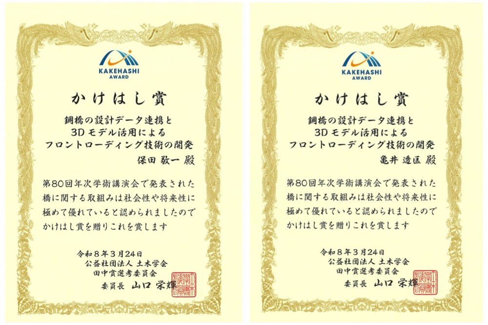 土木学会 田中賞選考委員会主催の「令和7年度かけはし賞」授賞式が、2026年3月24日(火)に土木学会にて開催され、オフィスケイワンから執筆者2名が出席いたしましたので、お知らせいたします。
