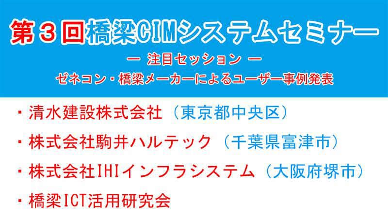 ユーザー事例では、清水建設株式会社、株式会社駒井ハルテック、株式会社IHIインフラシステム、ならびに橋梁ICT活用研究会における橋梁分野でのCIM活用の取り組みや運用事例についてご紹介いたしました。